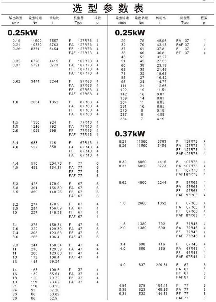 選型參數表0.25kW和0.37kW